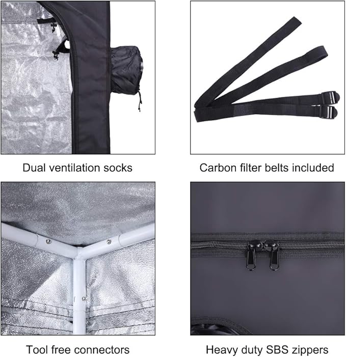 - ๐ฟ Easy assembly - Our growing tents are quite easy to set up. No tools needed. Zippers zip easily. There are privacy flaps over the zippers and it actually looks like a wardrobe closet, it's all black. Includes a removable & water resistant mylar spill tray, hanging bars and filter straps.