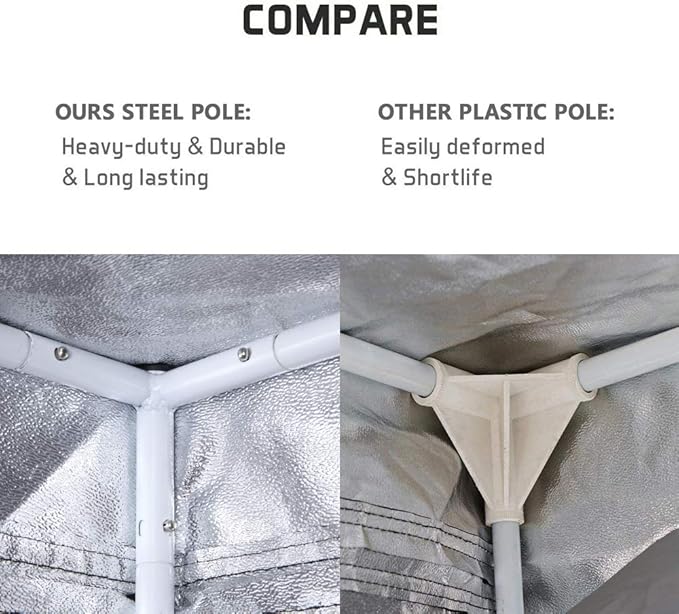 - ๐ฟ Tough Canvas & Durability- 600D material is tear proof and double stitched for perfect light blocking .Thick materials and durable zippers to make it a long-term use. It is is tear proof and water-resistance. Metal bars and metal connectors. Strong metal poles with easy click connector system. Our grow tent stands solidly