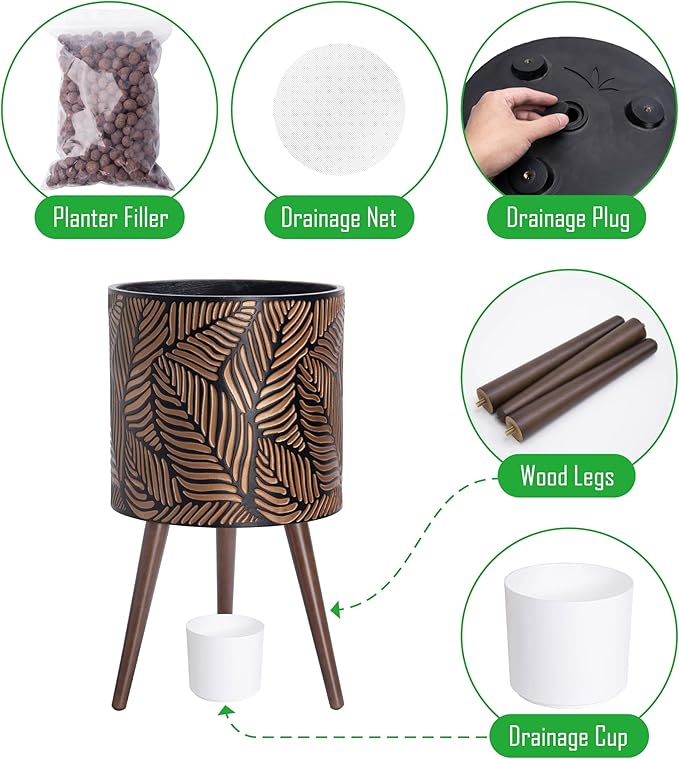 - What’s included: planter pot with drainage hole, drainage plug, set of stand – 3 solid wooden legs.