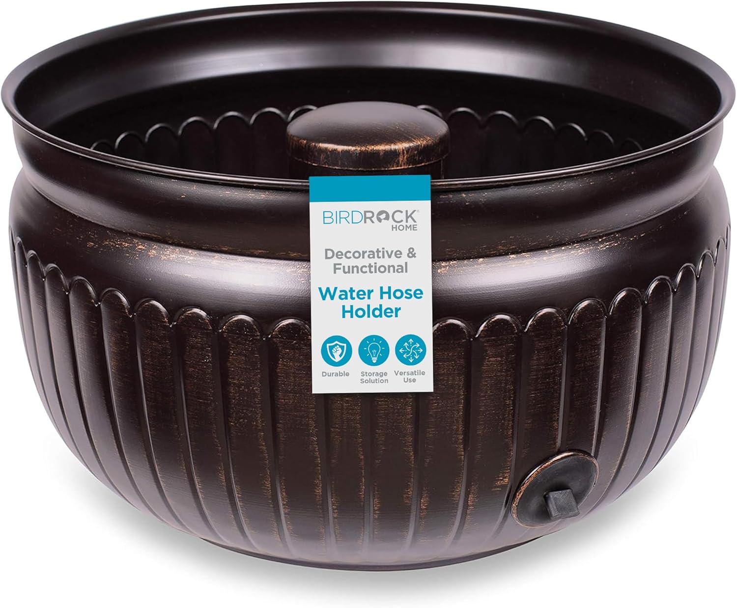 BIRDROCK HOME Water Hose Holder - Decorative Metal Pot, Indoor or Outdoor, Garden Storage Organizer, Patio Portable Bucket - Distressed Bronze, Holds up to 100ft Hoses, Medium No Lid