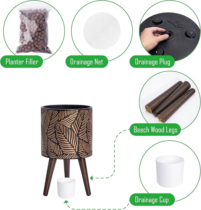- What’s included: planter pot with drainage hole, drainage plug, set of stand – 3 solid wooden legs.