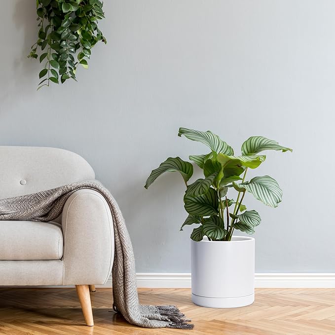 D'vine Dev 10 Inch Ceramic Planter Pot with Drainage Hole and Saucer, Indoor Cylinder Round Planter Pot, White, 94-O-E-1