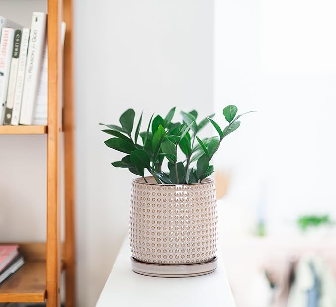 D'vine Dev 4 Inch Ceramic Beaded Stoneware Planter Pot - Flower Pot with Drainage Holes and Saucers for Indoor Succulent Plants or Flowers, Light Brown, 27-C-Z-4
