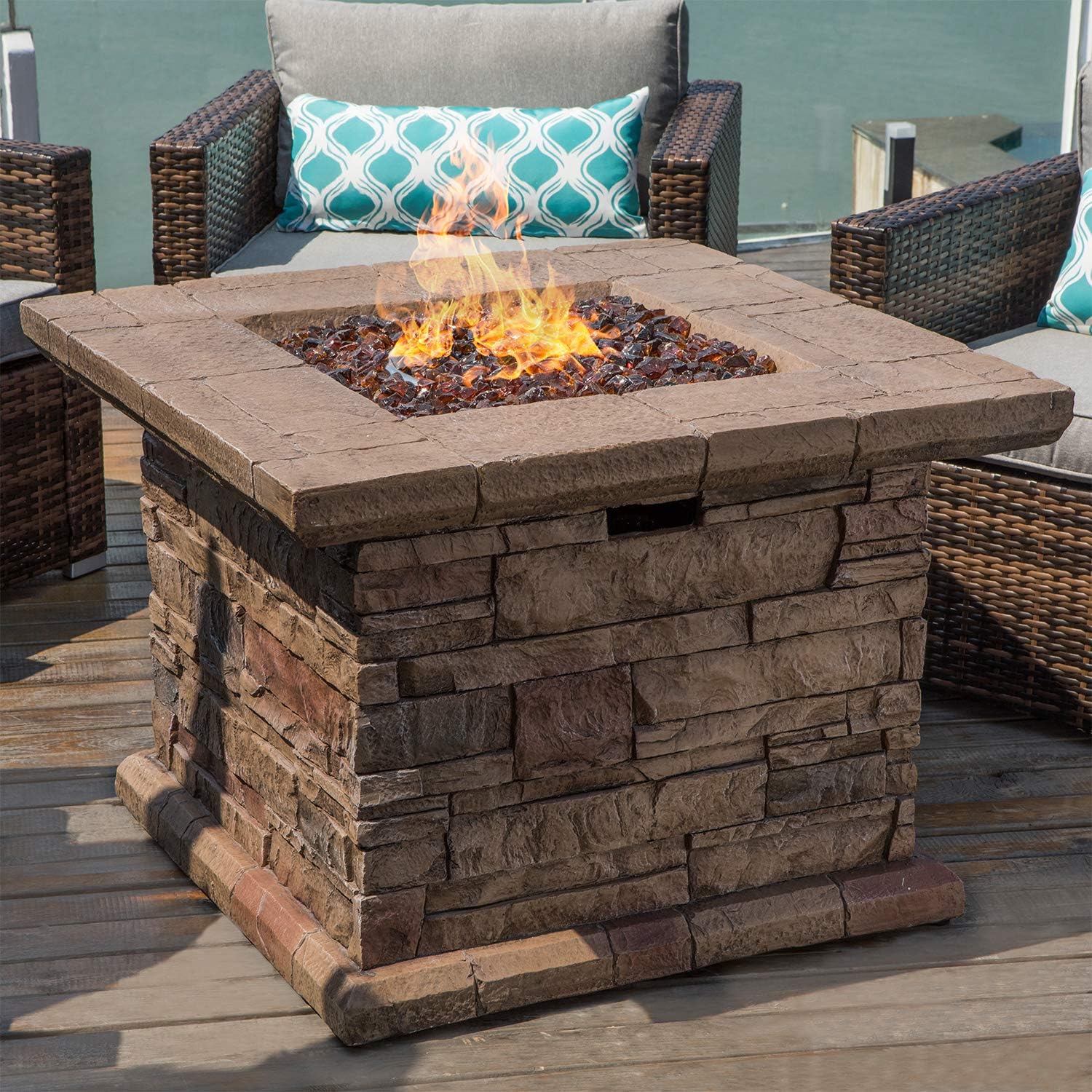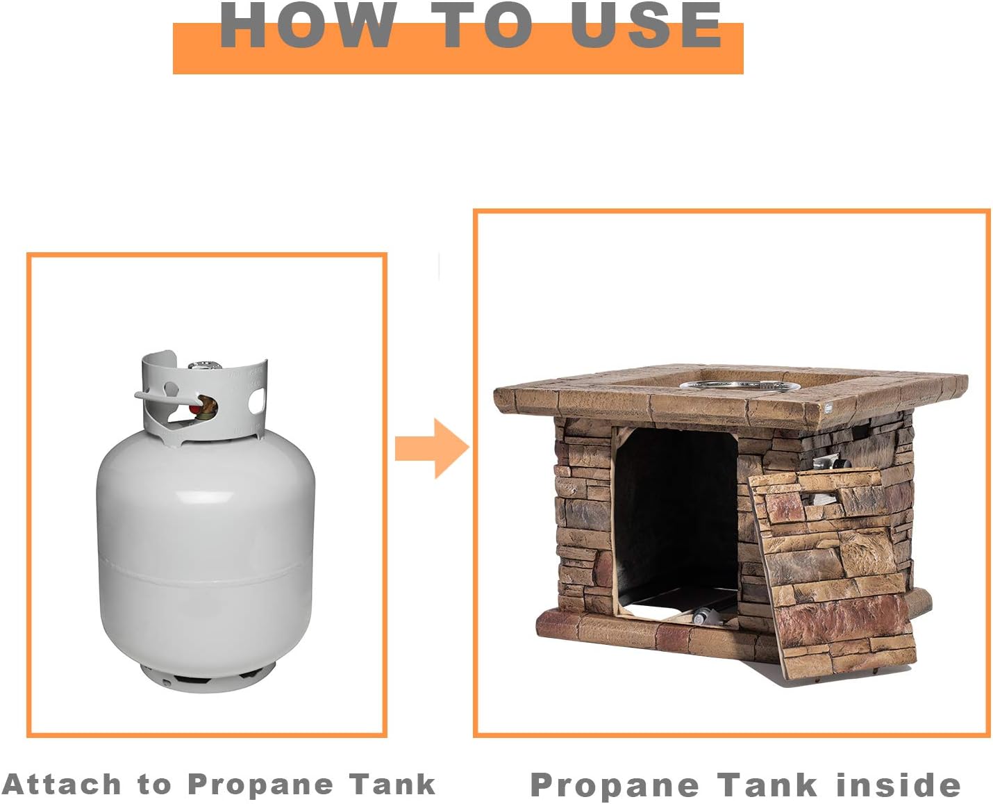 - π₯γ Gather Round the Fire γ: The cubic table base can conceal an ordinary 20lb propane tank ( not included) and features the classic stacked brown ledgestone mantle appearance. The tabletop extends further providing a perfect place for cocktails and appetizers. All built to last from sturdy, fire retardant magnesium oxide with a stainless steel burner bowl, low maintenance and resistant to heat. Lights with the push of a button and flame intensity is controlled by the turn of a knob.