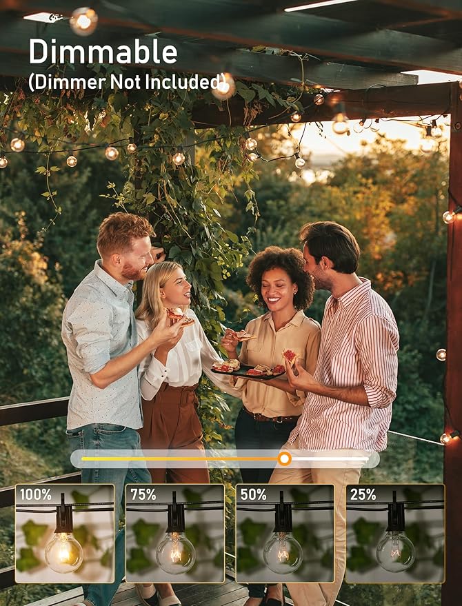 - 【Dimmable Compatible & Energy Saving】G40 outside string light come with 25 glass bulbs and 1 spare bulb. 1.5 inch light bulbs have E12/C7 candelabra socket base, 5W per bulb, warm white dimmable string light help you to save more electricity bill.