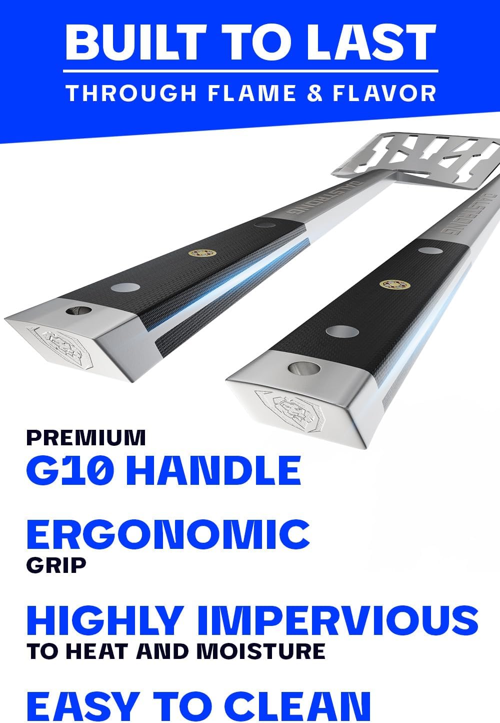 - Fire Up The Grill - The Dalstrong Premium G10 Grill Kit is professionally equipped with all the essentials to take your barbecue game to the next level and have you grilling like the pros. Featuring a complete set of top-shelf tools expertly crafted out of premium heavy-duty, solid 430 stainless steel, complimented with a military-grade G10 handle that is highly impervious to even the highest of grilling temperatures for life-long durability. This is not your average grill set!