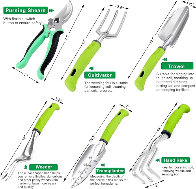 - โบHigh-quality and Sturdy Gardening Kit:The garden tool organizer with 6 large size metal hand tools are made of heavy-duty aluminum with Ultra-fine Polishing Technology to keep corrosion resistance and toughness. The gardening items are high hardness and no need to worry about rusting and breaking. The garden gifts handle is made of high-quality Tpr rubber with anti-slip performance and comfort to reduce hand and wrists fatigue, gardening gifts providing you with pleasure using experience.