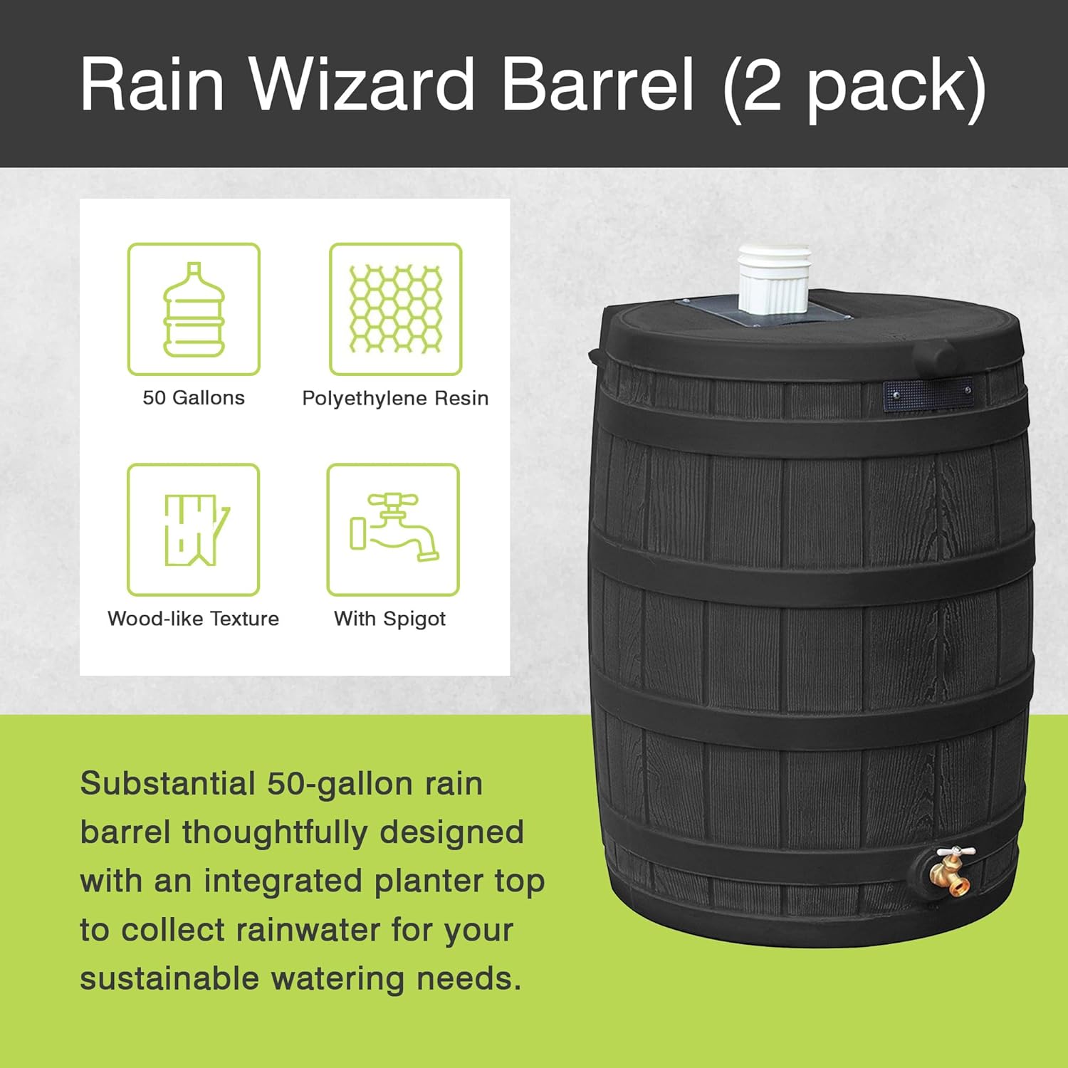 Good Ideas Rain Wizard 50 Gallon Plastic Outdoor Home Water Storage Tank Rain Barrel Collector with Brass Spigot and Flat Back Design, Black, 2 Pack