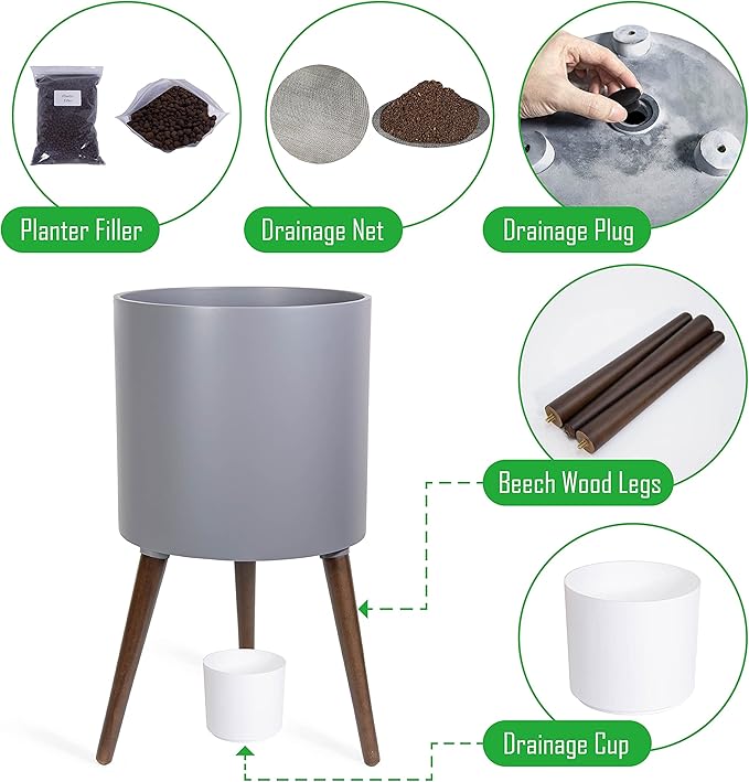D'vine Dev 14 Inch Planter Pot with Stand, Mid-Century Tall Plant Pot with Legs for Indoor Plants, X-Large, Grey, 88-O-D-3