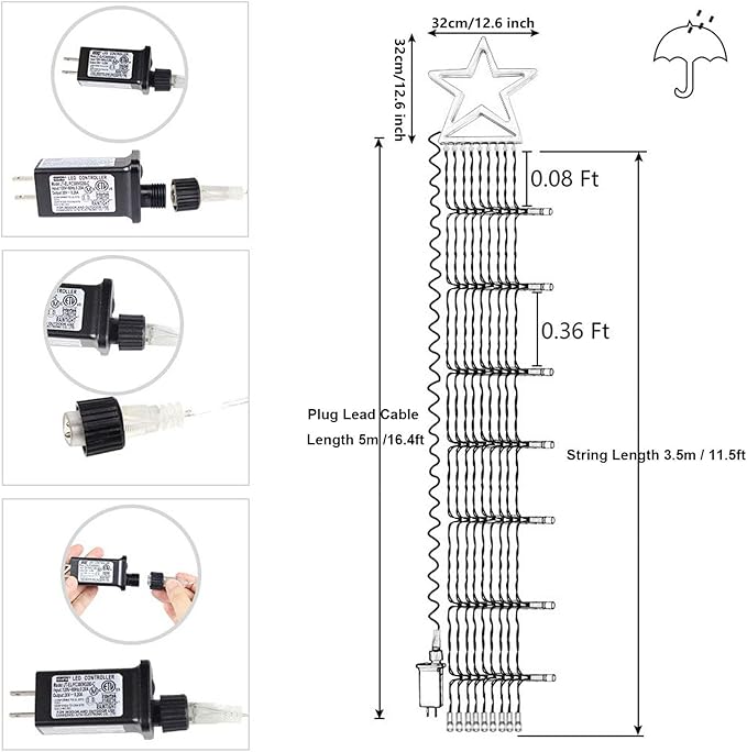 - 【Christmas Decorations Star Lights】Glowing in 320 ultra-bright LEDs, equipped with a 12 inches premium star ornament tree topper and 9 waterfalls 11.5ft long strands. Plug cable length:16.4ft. Light up Your Christmas with these Cerflyer Christmas decoration lights!