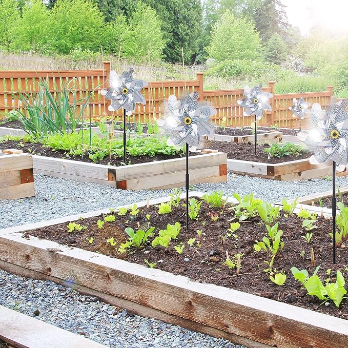 BATTIFE 10 Pack Reflective Pinwheels for Yard and Garden, Pre-Installed Sparkly Silver Blind Birds Pin Wheel, Scare Birds & Animal Away Wind Spinner