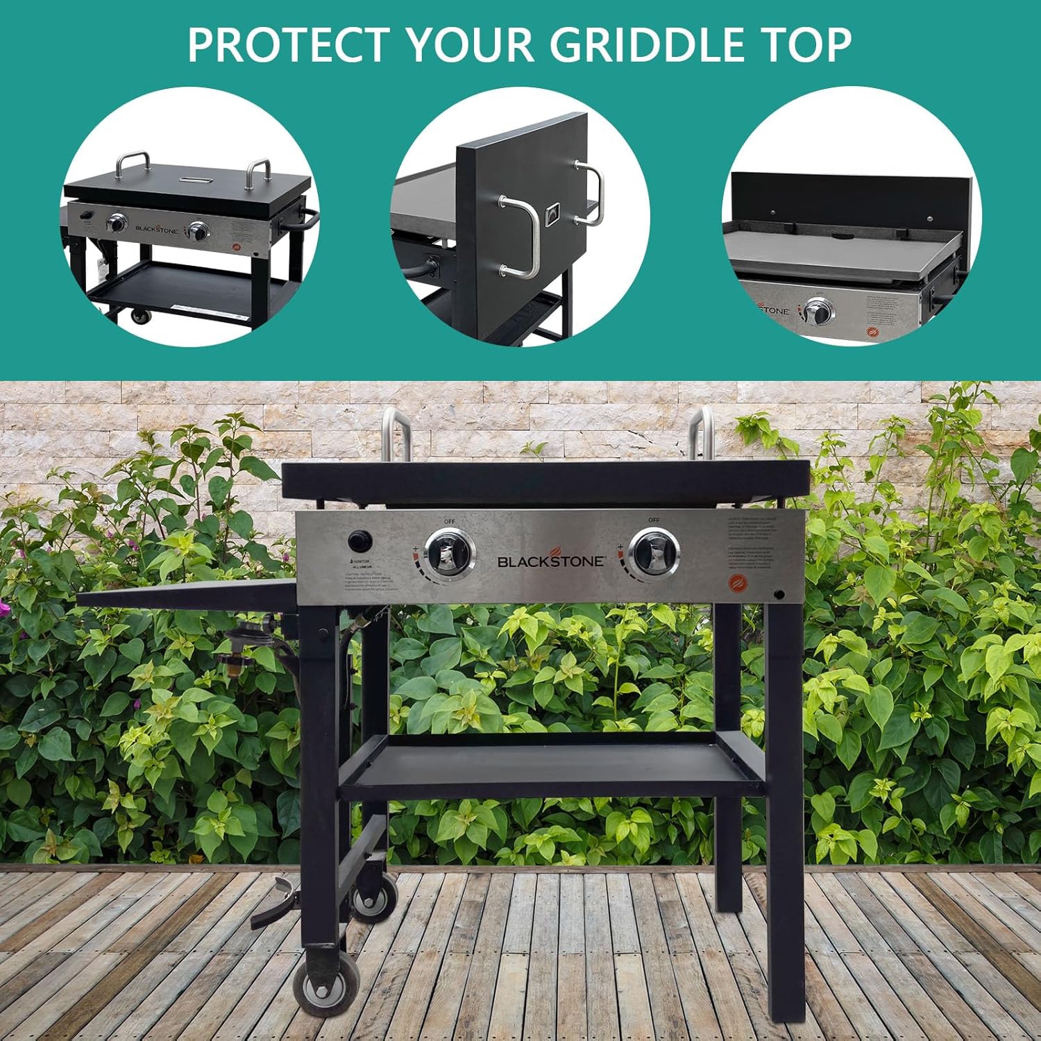 - The hard cover includes two brackets to hang the cover off the back of your griddle when not in use. The height of the two handles can support the grill cover, and the top of your grill cover will not collect water.
