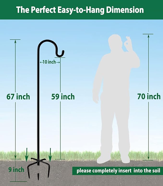 - ADJUSTABLE HEIGHT - The unique design of the bird feeder pole allows it to be freely adjustable to 44, 60 or 76 inches in height. Each shepherds hook includes 3 extenders with a length of 16 inches, it varies in height depending on how many extenders would be used. The maximum height of the plant hangers outdoor is 76in, which is very suitable for hanging bird feeder and squirrel baffle to keep squirrels or raccoons from eating.