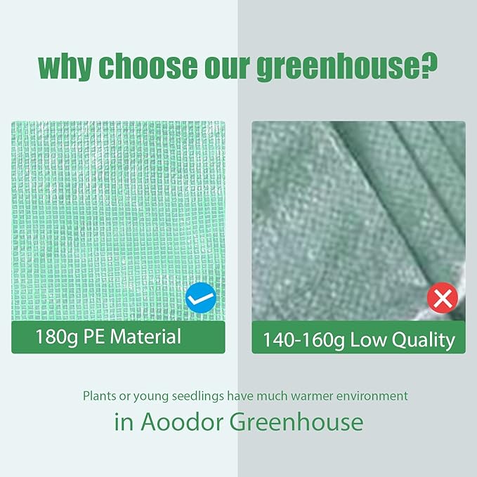 - Plant Protection: The Aoodor mini greenhouse kit shields your plants, seeds, vegetables, herbs, and flowers from the elements. The UV-protected and water-resistant greenhouse cover creates an optimal environment for growth