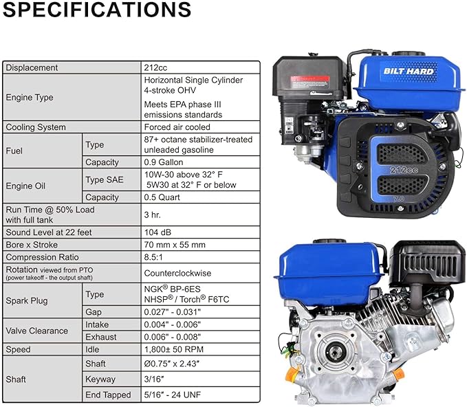 BILT HARD 7HP Gas Engine Horizontal Shaft, 212cc 4 Stroke OHV Industrial Grade Replacement Gas Motor, Shaft 3/4" (19mm) Diameter, 2-3/8" Long, 3/16" Keyway