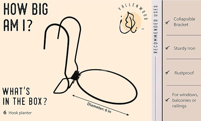 6 Pieces, 6 inches Iron Hanging Flower Pot. Metal Plant Wall Hanger, Vertical Garden. Planter Hook Ring, Rail Metal Fence. Indoor and Outdoor. Yard Garden. Wire Trellis. Collapsible Bracket. (Black)