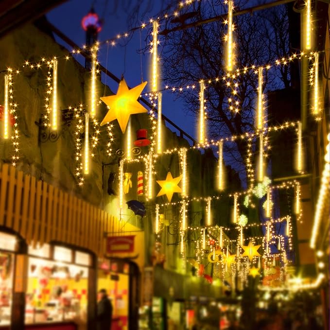 - 2-Pack 16 Tubes 384 LEDs Extendable Plug in Meteor Shower Lights for Christmas Decor: Super Bright with new upgraded LED bulbs, each bulb turn on and off one by one, like a realistic meteor shower.