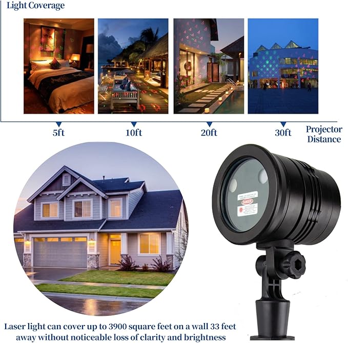 - ❄CHRISTMAS LIGHTS − Christmas projector light features 5 patterns including Snowflake, Jingle bell, Christmas tree, Santa Claus, and Starry sky, in addition to 3 display modes and 2 flashing modes, with 24 combinations in total. Highly bright laser projects red & green patterns that could cover up to 3900 sq.ft from 33 ft away without clarity loss, perfect for Christmasy ambiance creating.