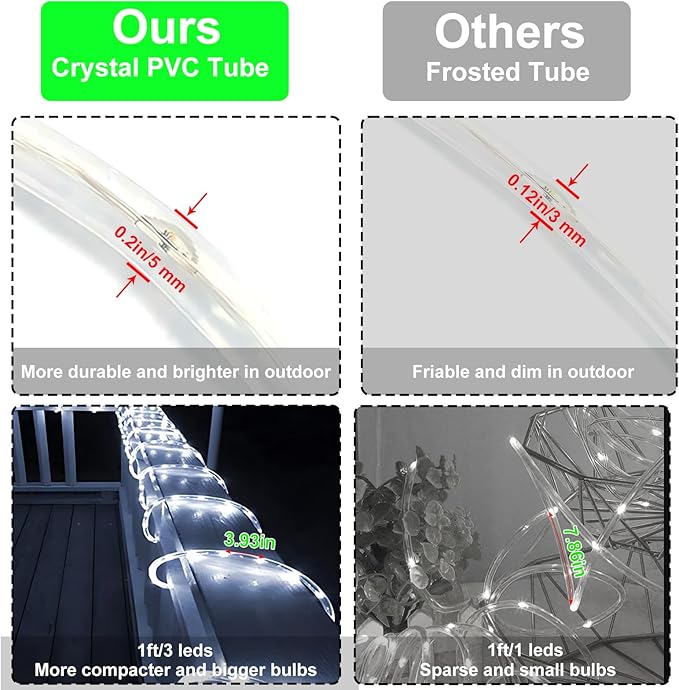 - 【Automatic Switch & Widely Use】After you turn on the rope lights, it will auto ON at dark and auto OFF by day. And it can automatically absorb light, after absorbing enough sunlight, it can last more than 8 hours. You don’t have to worry about replacing battery boxes or multiple outlets. Meanwhile the super flexible wire can be easily bent and shaped around plants, signs, furniture and almost everything else. You can make your yard charming and fantastic.