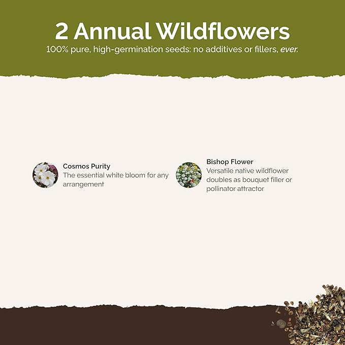 - 100% Pure, Non-GMO Seeds - No fillers, favorites only! Includes 2 easy-to-grow species: Cosmos Purity, Bishop's Flower