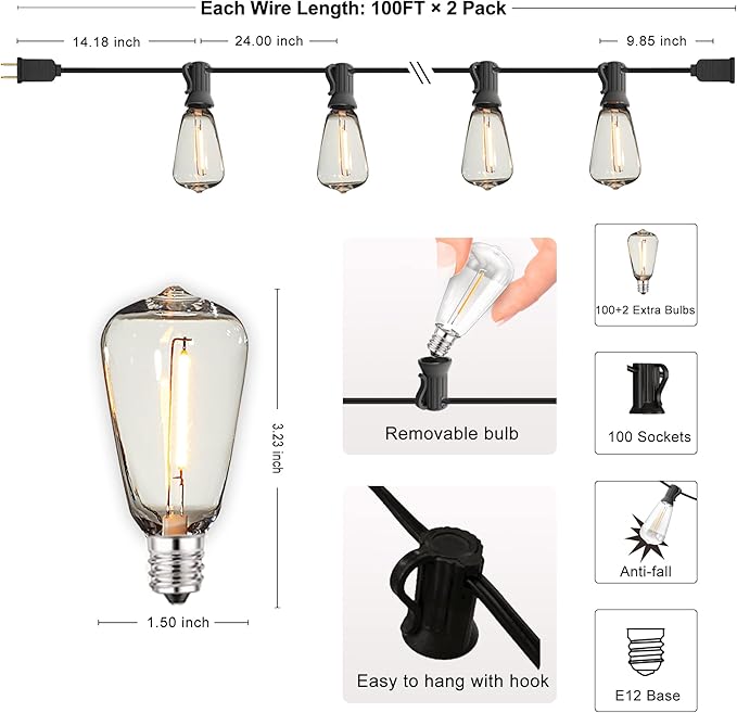 - Connectable and Easy Installation ST38 long dimmable string lights - 1.18 Ft lead with male plug, 2.00 Ft spacing between bulbs, 0.82 Ft tail with female connector. Each market light strand 50 Watts, End to end connectable up to 8 pack easily Simple Installation and easy-to-use socket loop design allows for hang up and installation anywhere thatโs desired โ hang all weather string lights in outdoor rafters for backyard, parties and weddings, or indoors for urban inspiration.