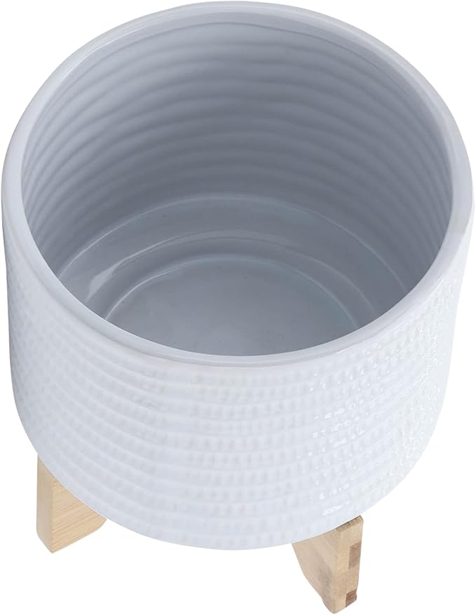 8" Ceramic Planter Stand, White with Wooden Base, Indoor/Outdoor Planter with Stand for Your Succulents and Small Plants, White Planter
