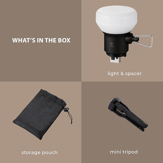 - MINI TRIPOD WITH HOOK - The Lamp also comes with a mini tripod that can be used as a stand and has a loop attached to the bottom for connecting carabiners for mounting to various items such as tents, trees, backpacks, and more.