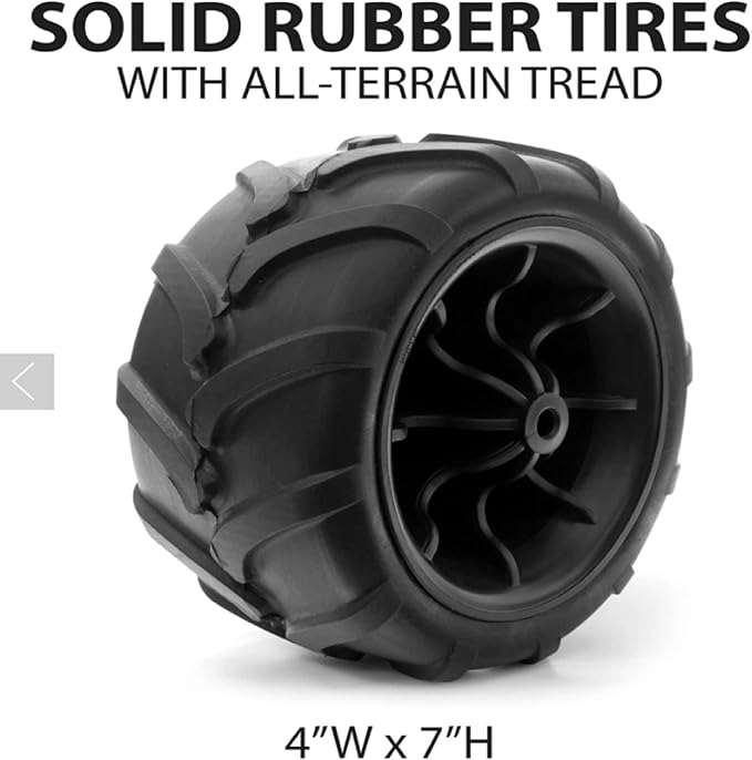 - WHEELS: All-terrain 4-inch wide wheels with rubber thread swivel 360 degrees for easy maneuvering in sand, snow or grass and a quiet ride on hard surfaces.
