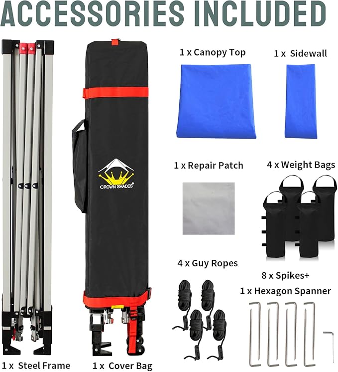 - STOโ N GO SYSTEM - Our lift-free system makes collapsing, storing, and transporting the 10x10 tent a breeze. The 10x10 tents can be stored with the fabric attached, with a specialized pocket for 4 sandbags, 8 stakes, and 4 guy ropes. Integrated wheels in the feet allow easy movement even when the instant shelter tent is set up, by simply lifting the side without wheels. This feature is especially useful for quick setup and takedown at locations like the patio or sports events