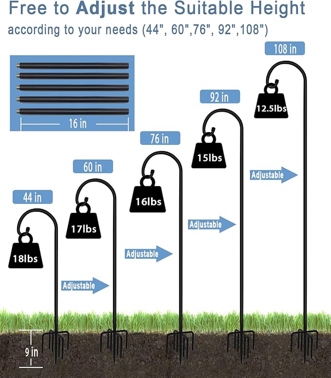 - Extendable & Tall Hook Hanger: The outside shepherd’s hook hanger made of 3/5 inch width & 2mm thickened steel pipe with 7 solid anchor points, you can free to adjust the suitable height for 108", 92", 76", 60" or 44", and also make it stands firmly in the ground without easily falling down, no fear of severe weather such as strong winds, heavy rains, and blizzards, (1 PACK / SET)