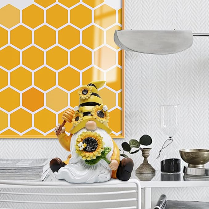 - Honey Bee Farmhouse Decorations: This is a honey bee gnome. The left hand takes a sunflower and the right side takes a faux honey dipper. The sunflower absorbs the bee and make this product so beautiful. It looks like the honey bee gnome is playing. That makes this product so happy. The bee collector and gnomes collector will love them. This funny product will make you happy. It is great addition to your bee themed tiered tray, riser, bookshelf or table decors.