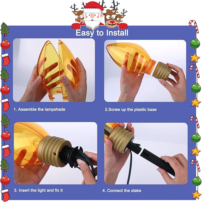- Replaceable: Turn the yard Christmas lights support on the base and pull out the internal C7 light bulb from the outer jumbo c9 bulb, screw out the damaged bulb from the bulb holder, then screw in a new one gently. And turning off one light will not cause the other lights to go out, which is very user-friendly. These light strings are extremely durable and have an average life of 5,000 hours
