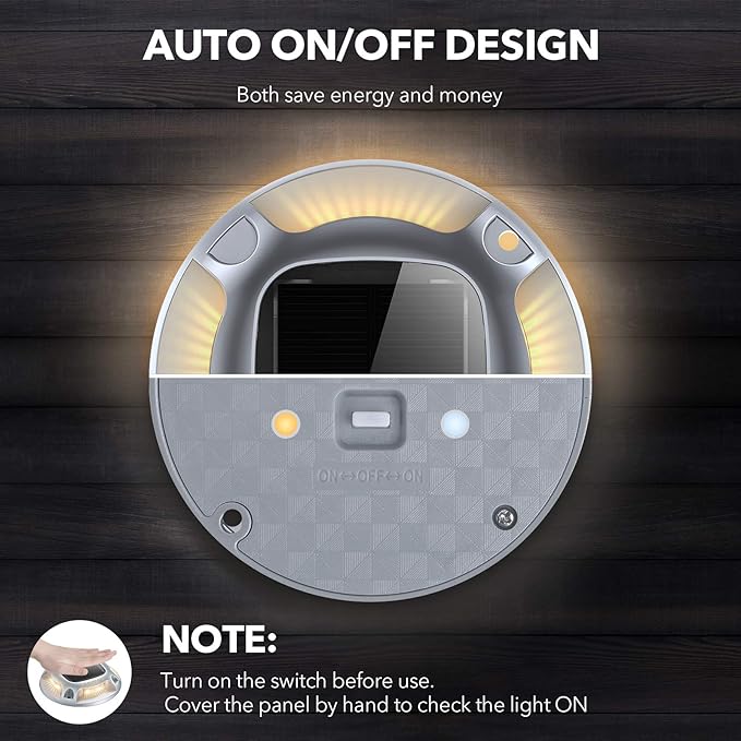 - 【FAST CHARGE & LONG LASTING LIGHTING】Adopt the advanced monocrystalline silicon solar panel and high capacity battery (600mAh). Our driveway lights support lighting up from dusk to dawn after 4-5 hours fully charge under full sunlight. No need for hand controlling, these lights will turn on automatically at dusk, and off at dawn.