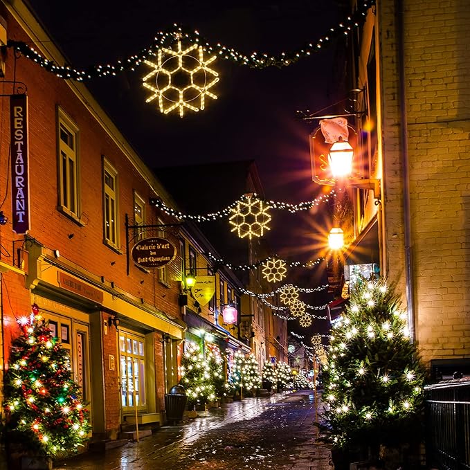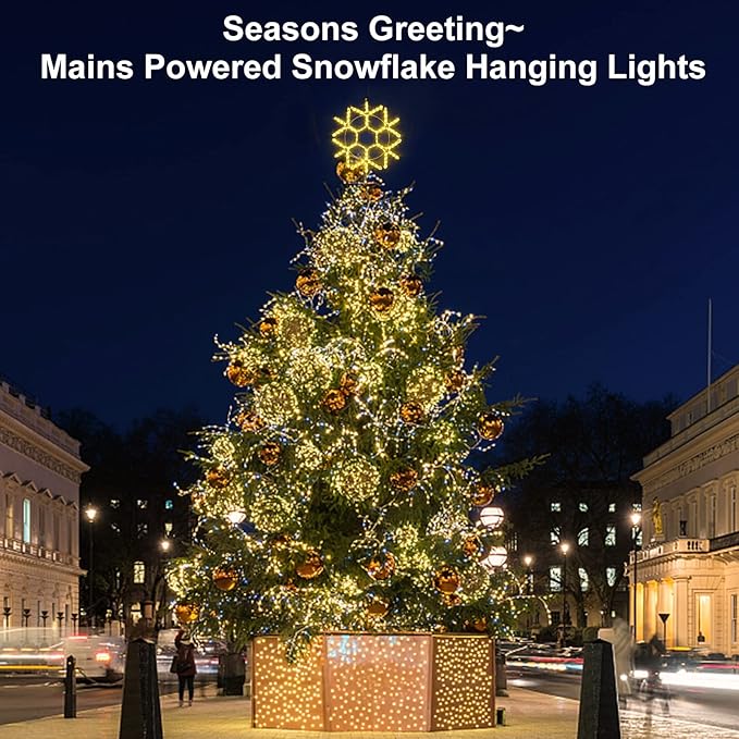 - Vivid Christmas Hanging Snowflake Lights for Indoor & Outdoor : Mains powered with safe 30v UL listed plug, Long 16.8 lead cord provides all kinds of variety applications such as wall, window, Christmas tree, roof, porch, railing, peak of garage.