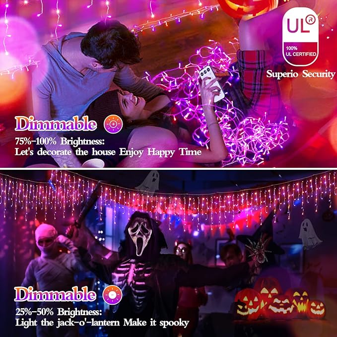 480 LED 49FT Halloween Lights Plug in 8 Modes with Timer Dimmable Halloween Decorations Outdoor Waterproof Indoor Curtain String Lights for Roof Porch Garden Holiday Wedding Party Decor Orange+Purple