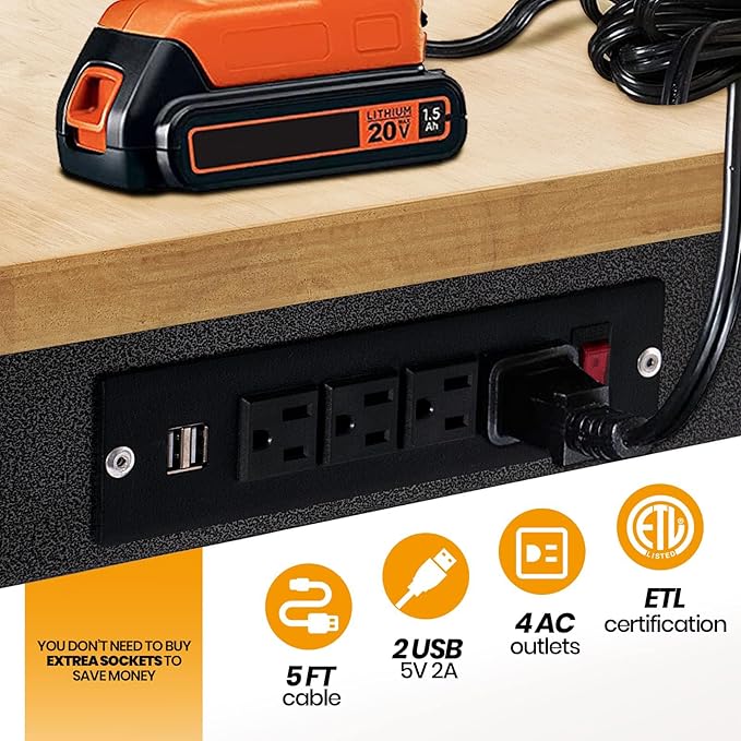 - 【Power Strip】We fitted a power outlet for the workbench.Convenient for you to use a variety of power tools and lamps. sewing table has 4 AC Outlets and 2 USB-A ports on the power strip
