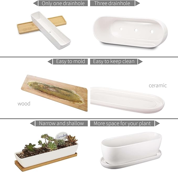 - DRAINAGE HOLE, CERAMIC TRAY: This succulent pot comes with 3 drainage holes at the bottom and a separate ceramic tray, which prevents the flower pot from overwatering. Installed for indoor or outdoor use. Ideal for planting herbs, succulents, cacti, etc