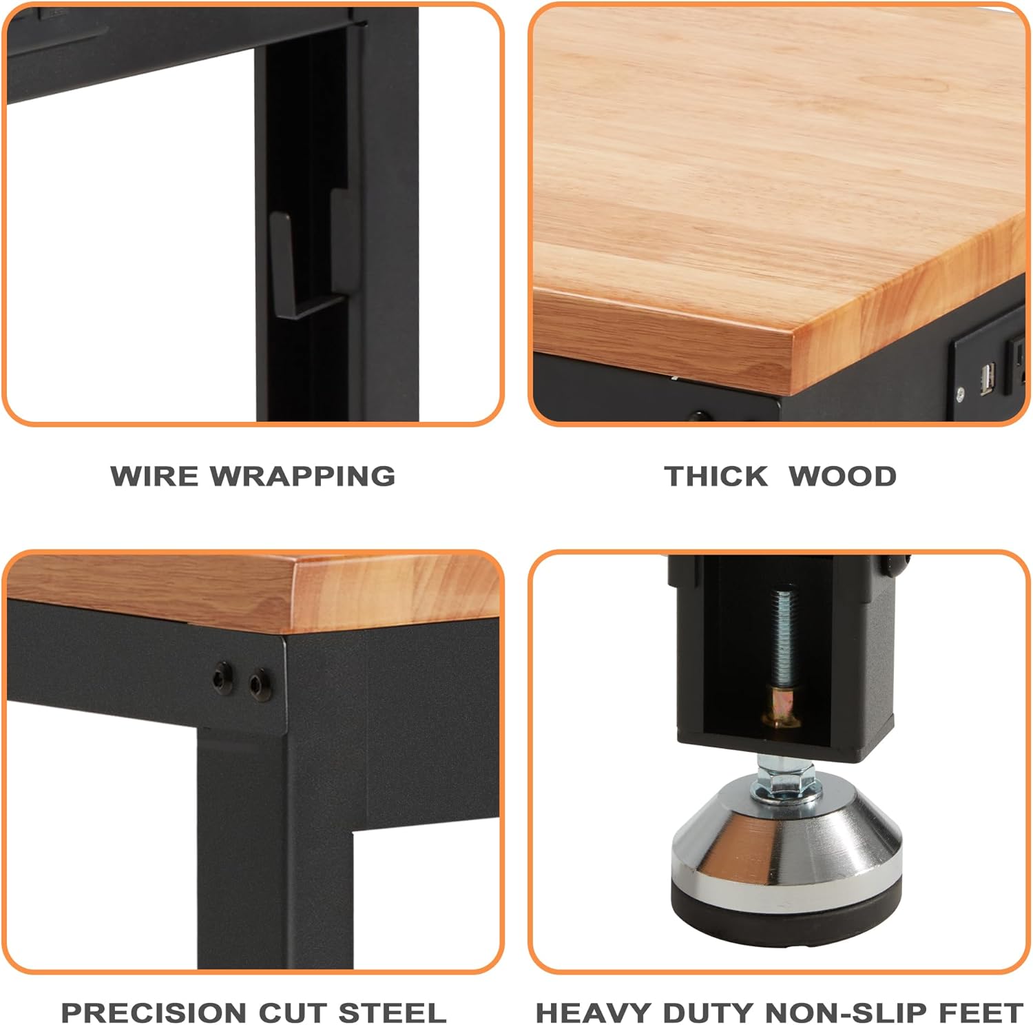 Haddockway Adjustable Workbench for Garage, 60" x 22" Rubber Wood Top Worktable with Power Outlets, Max 2000 Lbs Load Capacity Heavy Duty Workstation for Workshop Office Home (Black Frame, 60in)