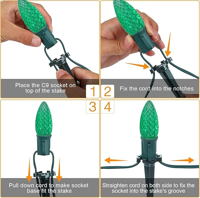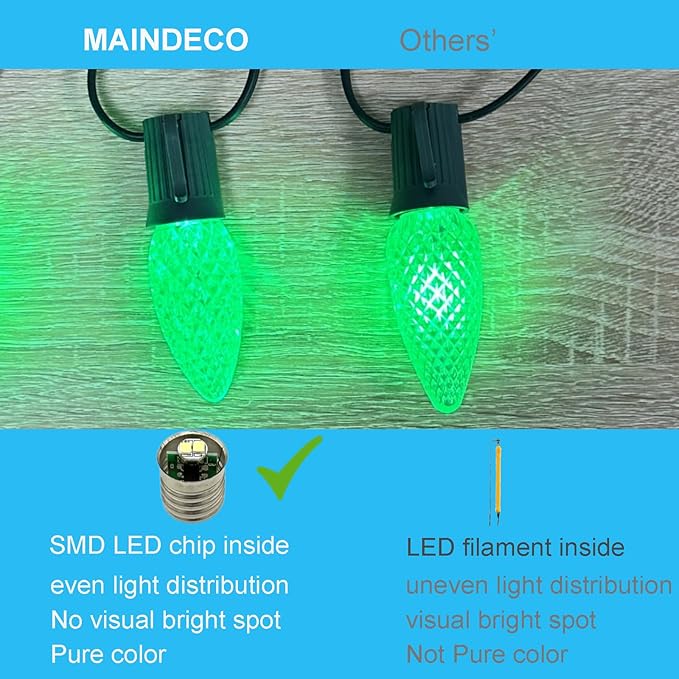 - C9 Multicolor LED Pathway Lights - MAINDECO C9 Christmas walkway lights are 30 feet long in total which contain 20 multicolor C9 LED SMD strawberry faceted bulbs with 18 inches spacing, 20 Stakes, E17 base sockets. After installing the ground stakes, it can be fixed in the ground to add Christmas holiday lights to your yard, garden and pathway, etc.