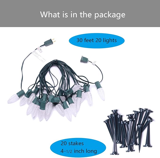 - C9 White LED Pathway Lights - MAINDECO C9 Christmas walkway lights are 30 feet long in total which contain 20 cool white C9 LED SMD strawberry faceted bulbs with 18 inches spacing, 20 Stakes, E17 base sockets. After installing the ground stakes, it can be fixed in the ground to add Christmas holiday lights to your yard, garden and pathway, etc.