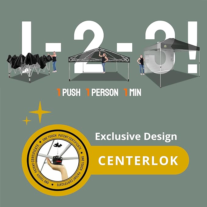 - ONE BUTTON EASY SET UP - Our 10x10 pop up canopy tent features patented one push center lock tech. With just a single push, the central hub locks the poles in place. Designed for the next generation, this outdoor canopy for patio can be set up by two people in seconds without any tools. Three adjustable height settings with soft, pinch-free buttons ensure convenience and safety, making it perfect for camping, beach outings, craft fairs, tailgating, farmer markets, outdoor BBQs, and more