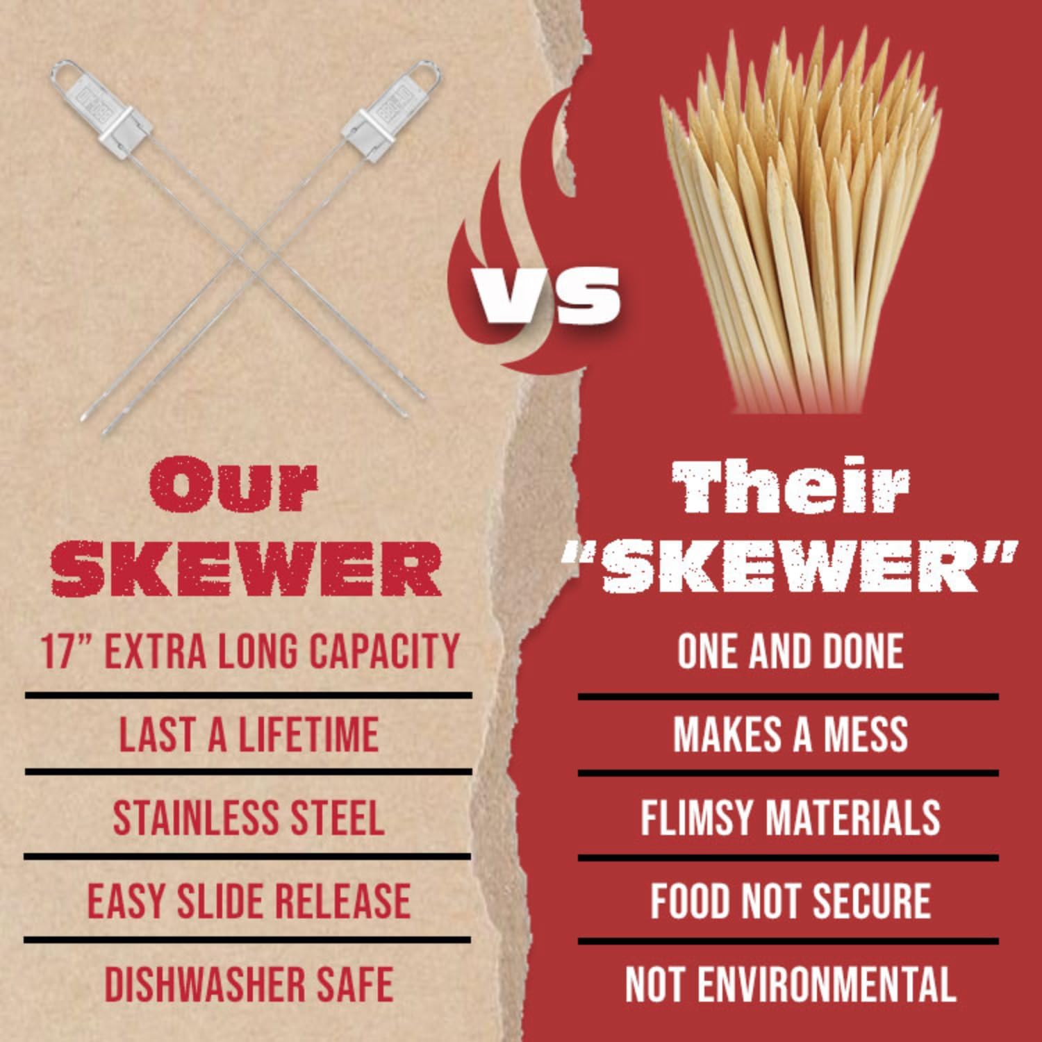 - 17" - The Longest Available: There is almost no limit to how much food you can load onto our XL Skewers. Pack as much meat as possible and easily remove all food with our integrated slider and long skewers!