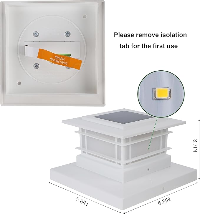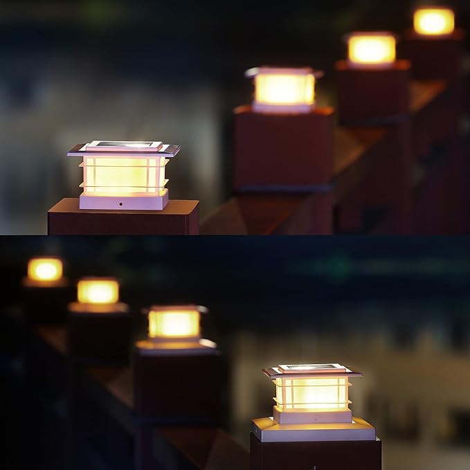 • WHITE PLASTIC SHELL SOLAR POST LIGHTS: 6 pack modern post cap lights powered by solar, each with 8 warm white SMD LED, they are the perfect decorative outdoor lighting and no electricity required. Add a 360 degree viewing angle illuminate charming to your garden, decorate your fence, deck, porch or yard. Measurement: 5.8 x 5.8 x 3.54 inches. Please note that the lighting is as shown in the figure, and there is No Flickering Flame Effect