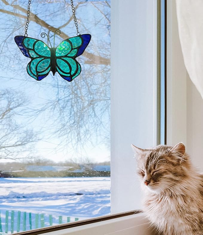 Blue Butterfly Suncatcher Stained Glass Window Hanging Panel Christmas Decor,Glass Butterfly Gift for Mom, Women 5.9×5.3Inch
