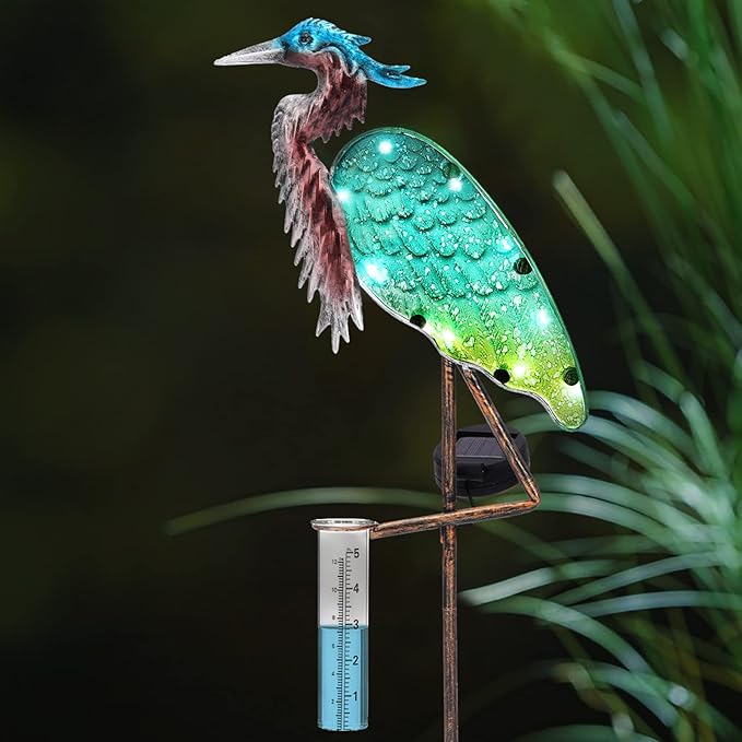 - 3-in-1: This rain gauge can not only record rainfall and let flowers and lawn grow better, but also its unique design can decorate your garden with soft lighting. This 3-in-1 heron rain gauge garden stake is a lovely accent piece to be enjoyed at night as well!