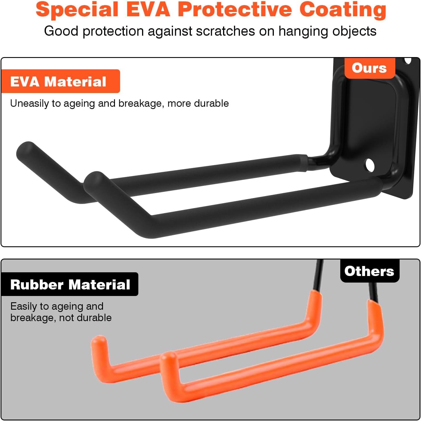 - NON-SLIP RUBBER COATED HOOKS -- Garage hooks with a rubber coating can be efficiently resistant to rusting, chipping, and cracking to allow longer durability and provide better friction on hanging your personal stuffs