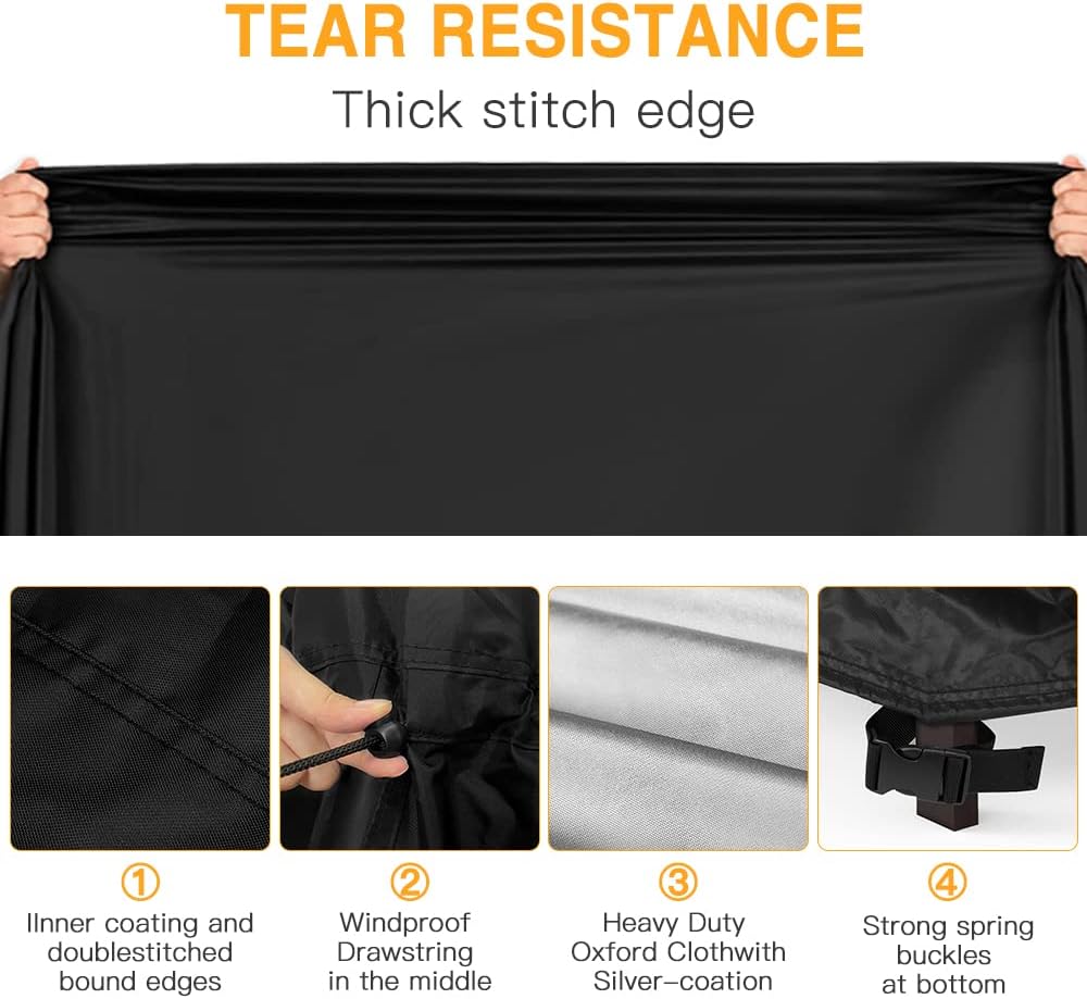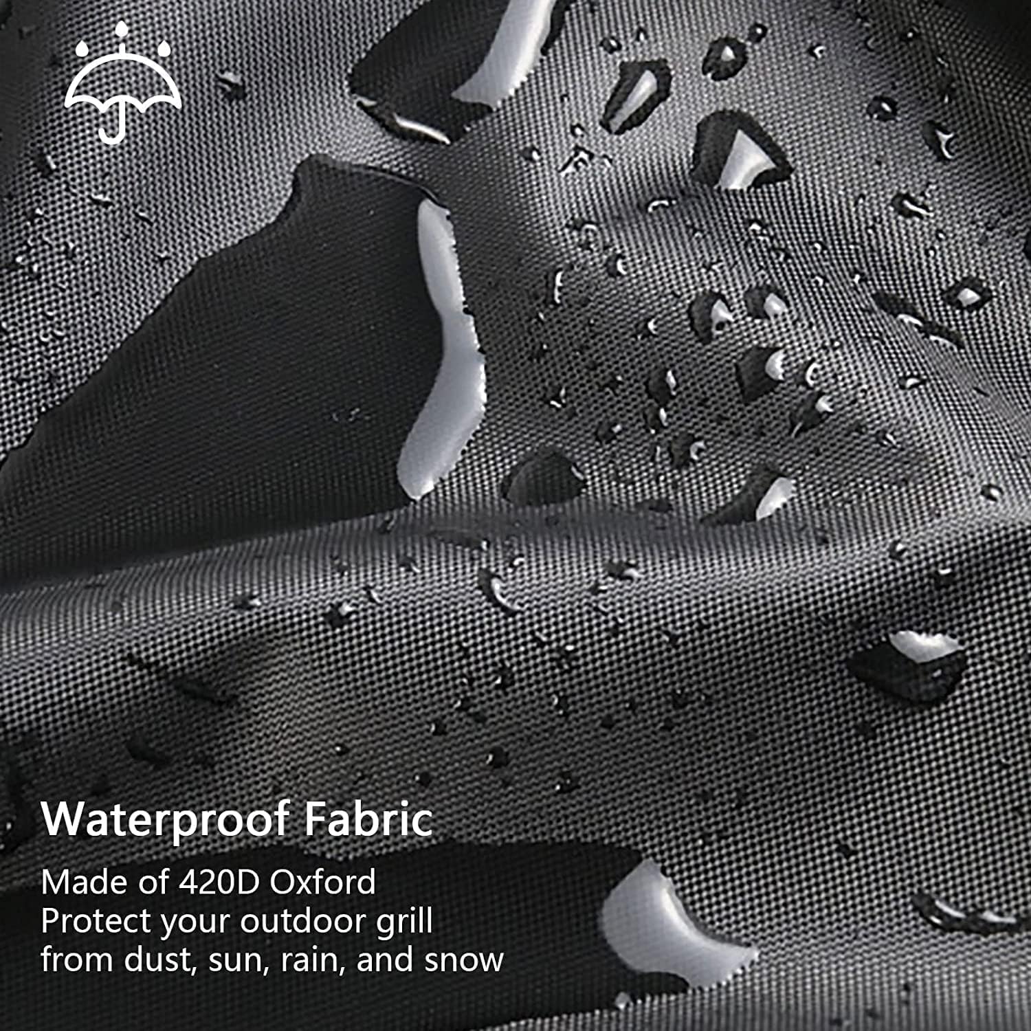 - Snug Fit & Upgraded Windproof BBQ Grill Cover - The bbq grill cover is equipped with padded handles and drawstring straps,360ยฐDrawcord Locking System, the drawstring cords both at the bottom and in the middle can be adjusted for a proper fit.The four buckles at the bottom can quickly tighten,making the grill cover tightly wrapped on your outdoor grill, not being blown away by the wind.