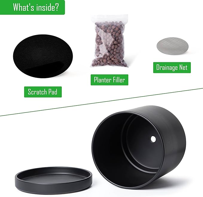 • Planter pot with drainage hole, mesh drainage net and protective scratch pad included.