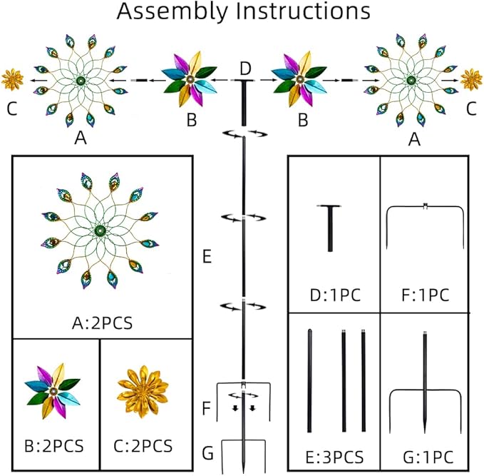 - 【Easy to Assemble】 Large wind spinner very easy to install, the whole process only cost you 2-3 minutes. No tools required,just need to tighten all components. A colorful addition to garden and yard.
