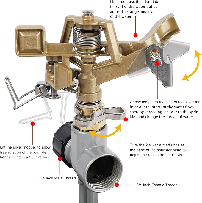 - IMPACT SPRINKLER WITH SPIKE: Heavy duty zinc alloy lawn impact sprinkler head with stand for yard, lawn and grass Irrigation. The lawn sprinkler can be adjusted from full circles of 360 degrees to partial circle patterns that turn 20 degrees to 340 degrees. Adjust the spray range and radian of water to make the irrigation in the garden fun